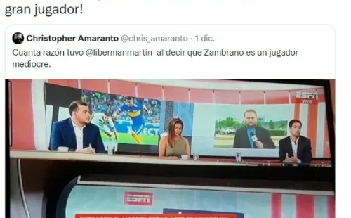 Esto dio pie para que el periodista argentino Martín Liberman pueda comentar sobre lo sucedido con Carlos Zambrano, por quien hace menos de un mes tuvo una fuerte discusión, vía Twitter con Jose Chávarri del programa ‘Al Ángulo’ de Movistar Deportes. El hombre de prensa publicó en su red social lo siguiente: “Una razón más por la cual Zambrano no será nunca un gran jugador”.