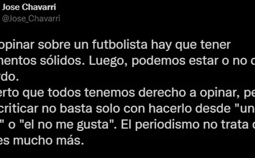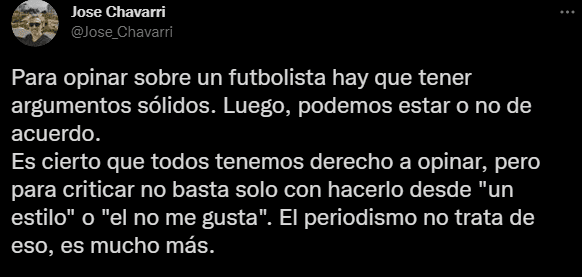 El comentarista del programa, Jose Chavarri en su cuenta de Twitter colocó una reflexión al respecto, sin decir nombres: “Para opinar sobre un futbolista hay que tener argumentos sólidos. Luego, podemos estar o no de acuerdo. Es cierto que todos tenemos derecho a opinar, pero para criticar no basta solo con hacerlo desde “un estilo” o el “no me gusta”. El periodismo no trata de eso, es mucho más”.