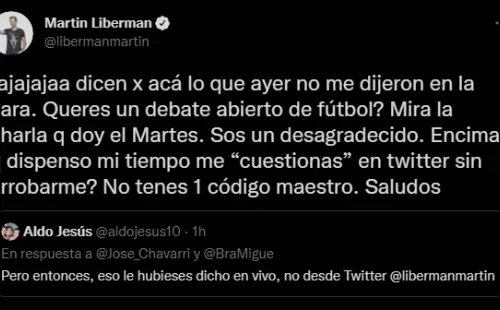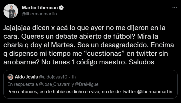 “¿Querés un debate abierto de fútbol? Mirá la charla que doy el martes. Sos un desagradecido. ¿Encima que dispenso mi tiempo me “cuestionas” en twitter sin arrobarme? No tenés 1 código maestro. Saludos”. Dejando en claro que no le gustó para nada la posición de Jose Chavarri, quien no lo encaró cuando lo tuvo enfrente por la noche en el ‘canal 3’.
