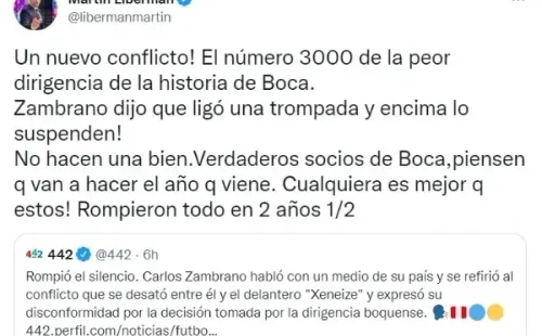 “Un nuevo conflicto. El número 3000 de la peor dirigencia de la historia de Boca. Zambrano dijo que ligó una trompada y encima lo suspenden“, comentó Martín Liberman a través de sus redes sociales. Exponiendo más su caso, el periodista siguió con su reflexión.