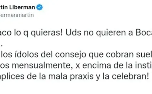 “Yo me saco lo que quieras. Ustedes no quieren a Boca. Puros bocones. Ponen a los ídolos del consejo que cobran sueldos millonarios mensualmente, por encima de la institución. ¡Son cómplices de la mala praxis y la celebran! Háganse cargo“, cerró Martín Liberman.