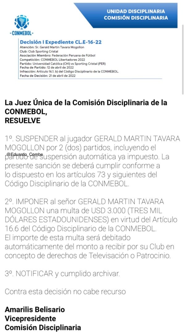 A la suspensión de dos fechas para Martín Távara se le suma una multa de 3 mil dólares. Esto se puede leer en el comunicado: “Suspender al jugador Gerald Martín Távara Mogollón por dos partidos, incluyendo el partido de suspensión automática ya impuesto e imponer una multa de 3000 dólares en virtud del artículo 16.6 del código Disciplinario de la Conmebol“.