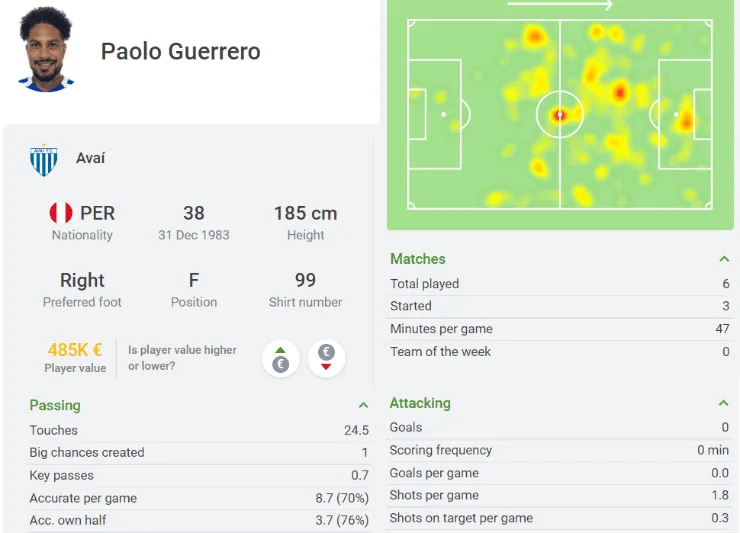 Según la estadística de Sofascore, Paolo Guerrero ha disputado seis partidos desde que fichó por el equipo ‘blanquiazul’.En tres de ellos fue titular, pero la producción efectiva en remates y goles es casi inexistente. Su promedio es de 1,8 tiros por partido y solo 0,3 por partido de pegadas al arco rival. Es por ello que el atacante peruano viene siendo duramente criticado por los aficionados de Avaí y algunos periodistas brasileños que continúan cuestionando su fichaje.