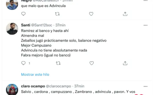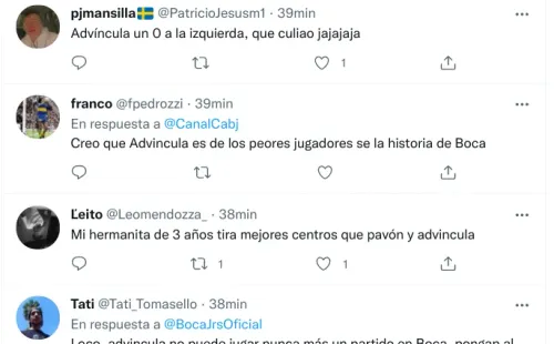 Tuvo un par de centros que fueron interceptados y los hinchas se pusieron cada vez peor. Los más severos dijeron que era uno de los peores refuerzos de la historia de Boca. Otros solo criticaron jugadas particulares. Acá les dejamos algunos comentarios.