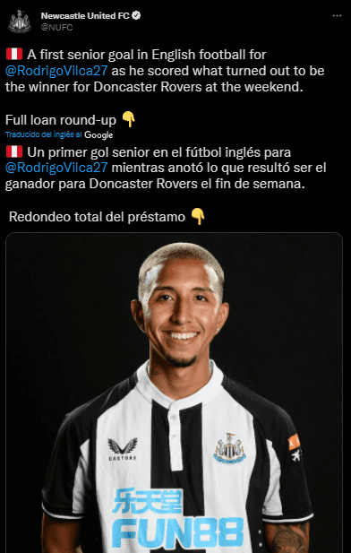 El último partido de Rodrigo Vilca en el Doncaster Rovers no pasó desapercibido en el club que lo contrató. Newcastle United le está dando seguimiento constante al futbolista peruano, por ese motivo se pusieron muy felices cuando se enteraron del club y victoria del ex Deportivo Municipal.