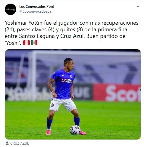 “Yoshimar Yotún fue el jugador con más recuperaciones (21), pases claves (4) y quites (8) de la primera final entre Santos Laguna y Cruz Azul. Buen partido de ‘Yoshi’”, informaron desde Convocados.