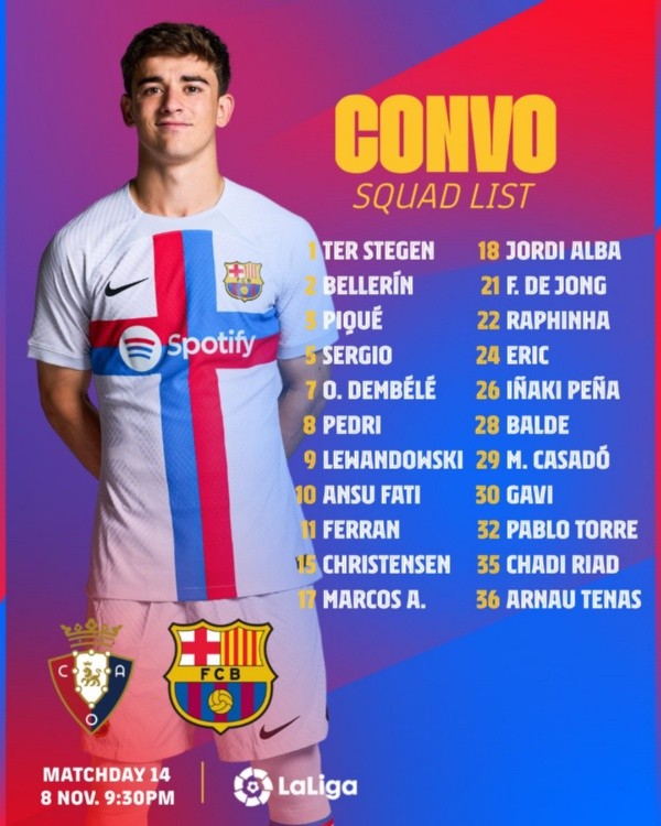 XI BARCELONA: Ter Stegen; Balde, Christensen, E García, Alonso; Gavi, De Jong, Pedri; Dembele, Lewandowski, Fati.