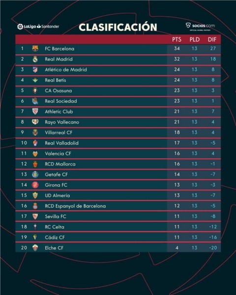 Desde que perdió 2-0 ante Villarreal el 17 de octubre, Osasuna ha ganado en Liga a Espanyol, Real Valladolid y Celta, además de empatar 1-1 con Girona, y la buena racha les ha llevado a situarse en la quinta posición de la tabla. Los Rojillos han ganado siete, empatado dos y perdido cuatro de sus 13 partidos ligueros esta temporada para sumar 23 puntos, lo que los ha dejado empatados con el Atlético de Madrid, tercer clasificado.