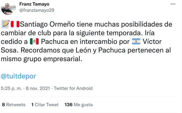 “Santiago Ormeño tiene muchas posibilidades de cambiar de club para la siguiente temporada. Iría cedido a Pachuca en intercambio por Víctor Sosa. Recordamos que León y Pachuca pertenecen al mismo grupo empresarial”, señaló por ejemplo Franz Tamayo de Depor.