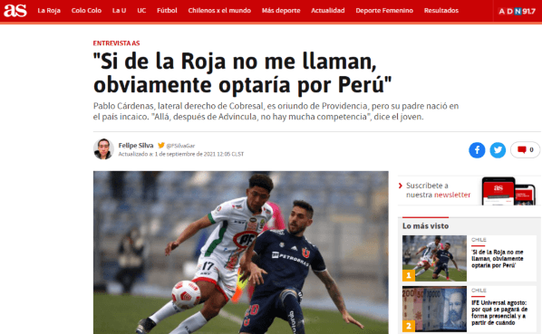 “Me han llegado cosas, notas, me ha hablado gente de Perú. Pero así, concretamente, de la Federación Peruana no han hablado conmigo. Quizás la prensa de allá se entera de que estoy en vista de ellos, qué sé yo. Pero son cosas que no sé si son verdad o mentira. Conmigo no se han contactado, al igual que aquí en Chile. Son cosas que se están hablando al aire”. Comenzó señalando el jugador de 21 años.