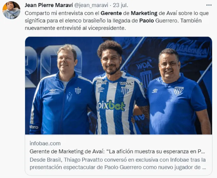 “Y en ese primer momento, los resultados ya se pueden ver desde el anuncio oficial de su contratación por parte de Avaí el miércoles, con la movilización de nuestra afición, así como en su presentación oficial hoy en el Estádio da Ressacada, donde acudieron miles de aficionados”, revelóThiago Pravatto en la entrevista con el periodista Jean Pierre Maraví.