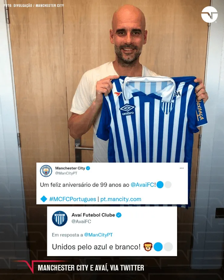 El Manchester City saludó este jueves al Avaí FC por su 99 aniversario, y para dicho saludo, le pidieron la colaboración al Pep Guardiola, DT de los ‘citizens’, quien posó muy sonriente con la camiseta del equipo de Paolo Guerrero. Cabe mencionar que el equipo inglés tiene como de costumbre saludar en fechas especiales a clubes sudamericanos, por su larga trayectoria de vida institucional.