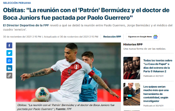 Explicando desde su conocimiento y experiencia, por qué se juntaron los directivos con el atacante ex Inter de Porto Alegre: “Yo creo que se trató a que Boca Juniors, al ser un club serio, no iba a planificar que viniera solo el médico del club a ver a Paolo Guerrero, entonces envió a un directivo (Bermúdez) con él. Imagino que ha sido de esa manera”.
