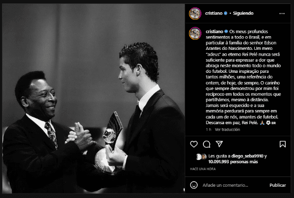 Eso se nota en este mensaje de CR7 hacia Pelé, donde se puede ver una tristeza gigante. Abrazando a Brasil a la distancia, desde el lugar donde esté. La foto principal es en una gala del balón de oro, donde tantas veces coincidieron y se dijeron cosas hermosas. Descansa en paz Rei infinito.