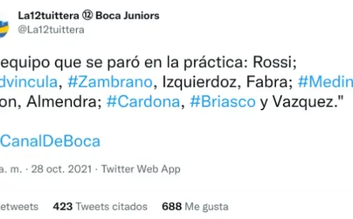 “El equipo que se paró en la práctica: Rossi; Advincula, Zambrano, Izquierdoz, Fabra; Medina, Rolon, Almendra; Cardona, Briasco y Vazquez”, escribieron en la cuenta mencionada. Ojalá, ahora, salga todo bien y se consoliden ambos ¡Confiamos en ustedes!