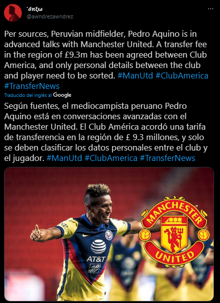 El comunicador europeo de ‘ANDRESPORT’ dejó una información en Twitter que remeció las redes sociales: “Según fuentes, el mediocampista peruano Pedro Aquino está en conversaciones avanzadas con el Manchester United. El Club América acordó una tarifa de transferencia en la región de £ 9.3 millones, y solo se deben clasificar los datos personales entre el club y el jugador”.