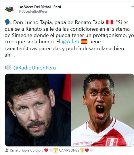 “Si es que se a Renato se le da las condiciones en el sistema de Simeone donde él pueda tener un protagonismo, yo creo que sería bueno. El Atleti tiene características parecidas y podría desarrollarse bien ahí”, igual opinó Lucho Tapia.