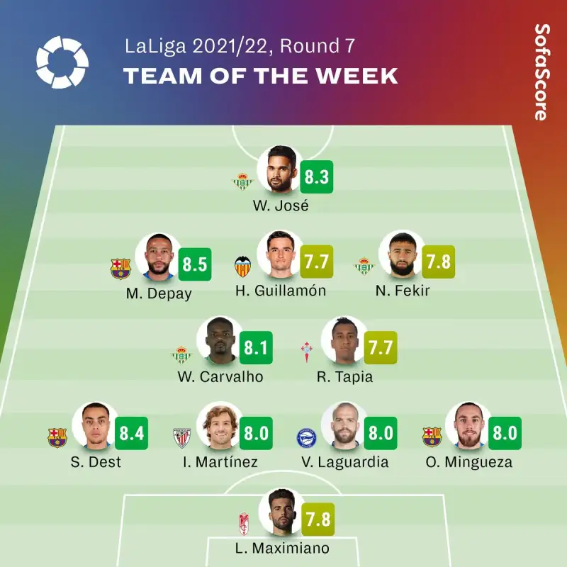 “Maximiano (Granada); Dest (Barcelona), Martínez (Athletic de Bilbao), Laguardia (Alavés), Óscar Mingueza (Barcelona); Carvalho (Real Betis), Renato Tapia (Celta de Vigo); Depay (Barcelona), Guillamón (Valencia), Fekir (Real Betis) y José (Real Betis)”.
