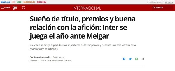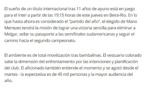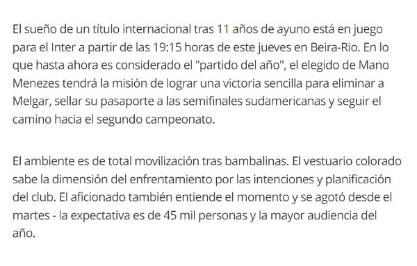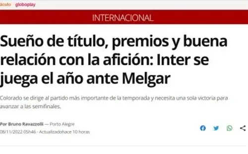 Lo cierto del cotejo es que la prensa brasileña está en calidad de alerta. Con comentarios del portal Globoesporte, el medio brasileño destaca que Internacional de Porto Alegre se juega su partido del año. Mencionándolo en el inicio de una extensa nota, el periodista Bruno Ravazzolli argumenta su comentario.