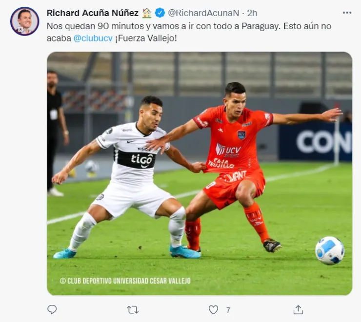 “Nos quedan 90 minutos y vamos a ir con todo a Paraguay. Esto aún no acaba, César Vallejo ¡Fuerza Vallejo!”, fue el mensaje que posteó elpresidente del cuadro ‘Poeta’Richard Acuña en su cuenta de Twitter.