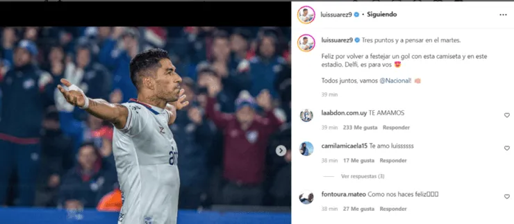 Luego del gol, el delantero ‘charrúa’ se manifestó en las redes sociales. “Tres puntos y a pensar en el martes. Feliz por volver a festejar un gol con esta camiseta y en este estadio. Delfi, es para vos. ¡Todos juntos, vamos Nacional!”.