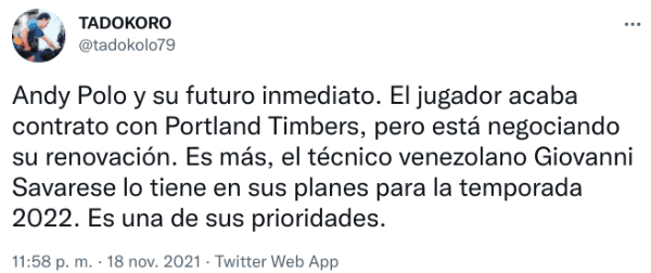 Este viernes, sin embargo, TADOKORO, comunicador reconocido de twitter, sacó información al respecto: “Andy Polo y su futuro inmediato. El jugador acaba contrato con Portland Timbers, pero está negociando su renovación. Es más, el técnico venezolano Giovanni Savarese lo tiene en sus planes para la temporada 2022. Es una de sus prioridades”. por ahora, parece difícil la vuelta en U ¡Paciencia!