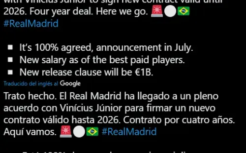 Dejando en claro que no hay dudas, y próximamente se cumplirán las formalidades para ver a Vinícius Júnior haciendo aún más extensa con el Real Madrid. Para sus seguidores, aquí la segunda y última parte: “Está 100% de acuerdo, anuncio en julio. Nuevo salario a partir de los jugadores mejor pagados. La nueva cláusula de liberación será € 1B”.