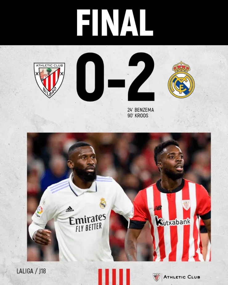 Marcador: Athletic Bilbao vs. Real Madrid, por la jornada 18 de la Liga Española