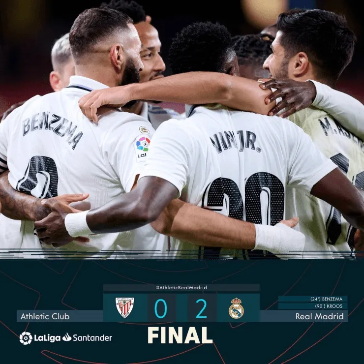 Pero minutos después, el Madrid consiguió el primer tanto del partido gracias a su goleador francés, Karim Benzema. Un disparo con la pierna izquierda, desde el centro del área, que nada pudo hacer el arquero Unai Simón.
