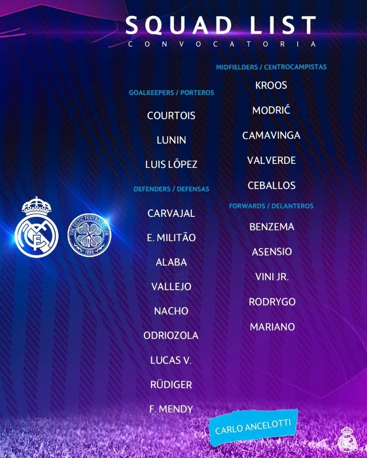 El Real Madrid no podrá contar con el ganador del Balón de Oro, Karim Benzema, para este encuentro, ya que el francés sigue recuperándose de la fatiga muscular tras tres partidos de baja. Después de haber jugado nueve partidos durante el mes de octubre, y con un viaje complicado al Rayo Vallecano el fin de semana, espere ver algunas rotaciones en el XI extremadamente competitivo de Carlo Ancelotti.