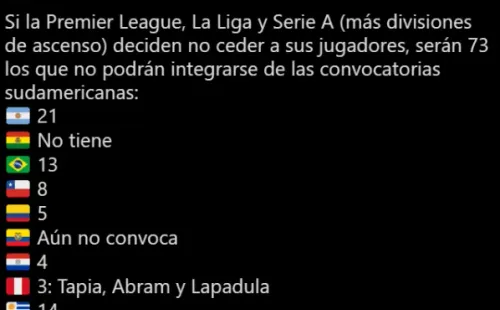 Pero hasta el momento, solo se sabe que los jugadores sudamericanos de las ligas mencionadas, no estarán llegando para representar a sus países. Y este número de bajas es muy importante, acá te detallamos cómo se maneja el número de futbolistas impedidos de llegar a sus selecciones.