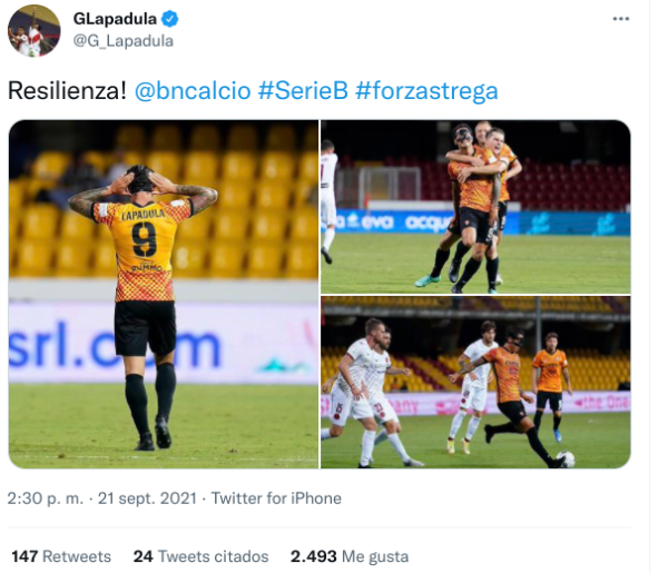Tras esto, como suele hacerlo, se manifestó en las redes sociales. “Resiliencia”, escribió en italiano junto a tres fotos del encuentro de esta tarde. Así, el peruano demostra toda su calidad y pone a su equipo en los primeros puestos de la Serie B ¡Bien Lapa!