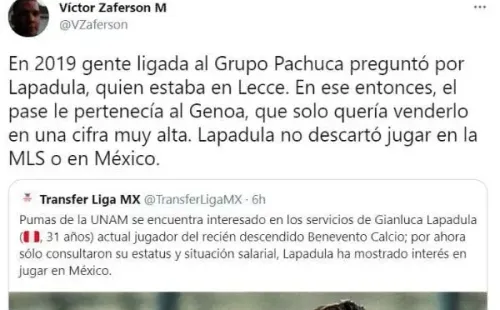 Víctor Zaferson validó la información con un dato: “En 2019 gente ligada al Grupo Pachuca preguntó por Lapadula, quien estaba en Lecce. En ese entonces, el pase le pertenecía al Genoa, que solo quería venderlo en una cifra muy alta. Lapadula no descartó jugar en la MLS o en México”.