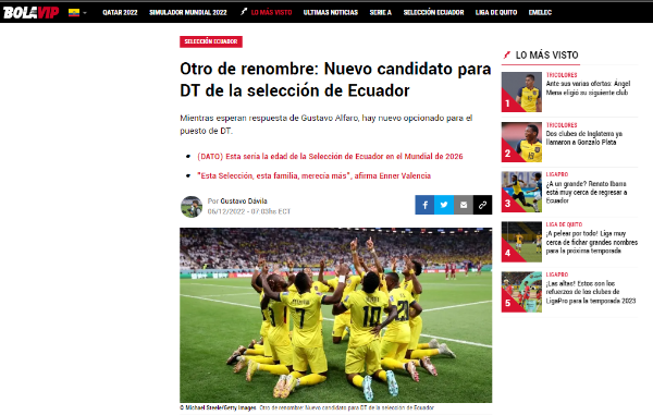 “El periodista Vito Munoz contó que la Ecuafútbol está en conversaciones con el argentino Ricardo Gareca, ex seleccionador de Perú y el responsable de llevar a los del vecino país a un Mundial luego de 36 años. En su momento ya fue contactado, pero el factor económico alejaba al DT”, menciona el portal de noticias aliado de Bolavip Perú.
