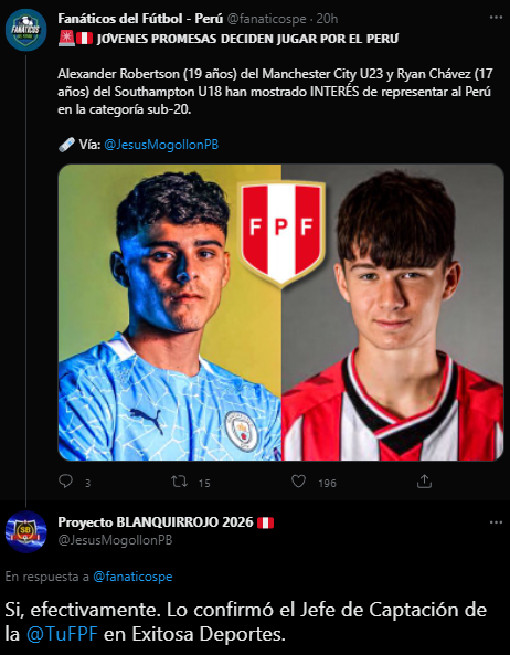 Según menciona líneas abajo, se trata de dos específicamente: “Alexander Robertson (19 años) del Manchester City U23 y Ryan Chávez (17 años) del Southampton U18 han mostrado INTERÉS de representar al Perú en la categoría sub-20”. Citando después a quien lanzó este dato, la popular cuenta de ‘Proyecto BLANQUIRROJO 2026’, manejada por Jesús Mogollón.