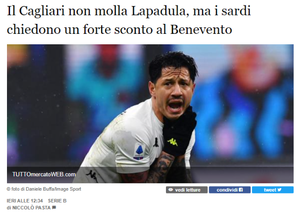 Con el siguiente titular: “El Cagliari no renuncia a Lapadula, pero los sardos piden un fuerte descuento al Benevento”. Para después explicar cómo se están gestionando los movimientos del equipo que acaba de descender a la segunda división. Tiene la obligación de subir automáticamente, por su trascendencia en ‘Serie A’.