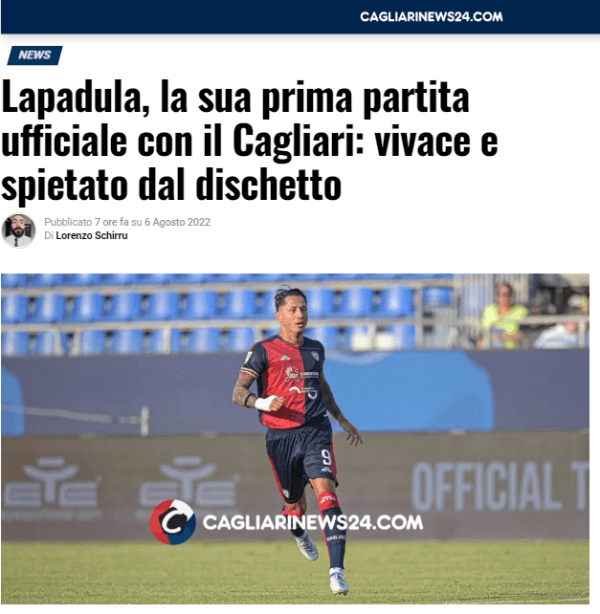 “El jugador ítalo-peruano estuvo inexorablemente entre los protagonistas del partido, demostrando por qué Cagliari lo siguió durante tanto tiempo en este bochornoso mercado de fichajes de verano. Según informa la Unión Sarda, Lapadula no hizo cosas sensacionales, pero desde luego estuvo implacable desde el punto de penalti, vivacidad, contagió al equipo, profundidad y más personalidad al ataque en el momento crucial del partido. Calificación del marcador: 6.5”. Así lo quieren a Gianluca Lapadula, quien se hace un nombre en Cagliari.