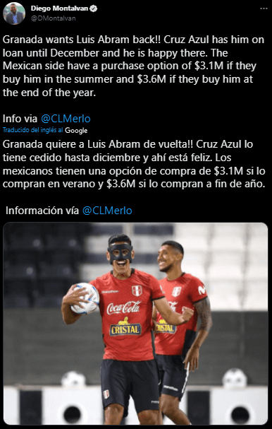 “¡¡Granada quiere a Luis Abram de vuelta!! Cruz Azul lo tiene cedido hasta diciembre y ahí está feliz. Los mexicanos tienen una opción de compra de $3.1M si lo compran en verano y $3.6M si lo compran a fin de año”. Es lo que presentó en su cuenta de Twitter Montalvan para el público peruano.