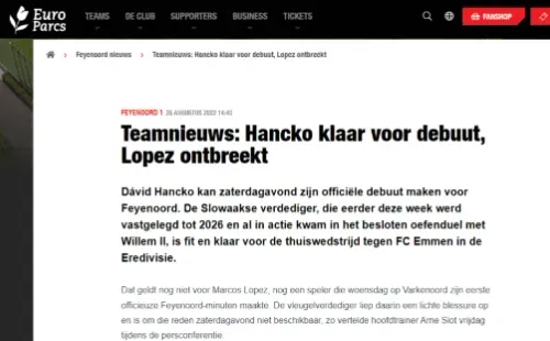 Mediante un boletín informativo, se pudo conocer cómo estará trabajando el también extremo ofensivo nacional. Primero contextualiza la novedad principal del equipo: “Dávid Hancko puede hacer su debut oficial con el Feyenoord el sábado por la noche. El defensa eslovaco, que firmó hasta 2026 a principios de esta semana y ya jugó en el partido de exhibición cerrado con Willem II, está en forma y listo para el partido en casa contra el FC Emmen en la Eredivisie”.
