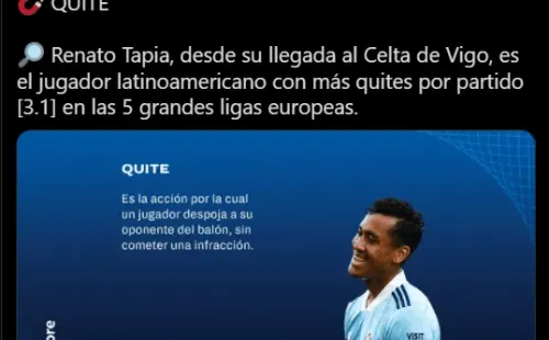 La aplicación mundialmente conocida como ‘SofaScore’ propone lo siguiente con respecto a Renato Tapia: “Desde su llegada al Celta de Vigo, es el jugador latinoamericano con más quites por partido [3.1] en las 5 grandes ligas europeas”. En otras palabras, es el mejor del mundo élite ‘futbolero’ a la hora de ejercer el puesto de ‘pivote’.