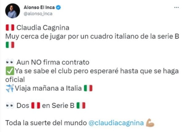 Yendo al tema principal, el periodista Alonso El Inca, contó los últimos detalles sobre la jugadora, quien estaría próxima a desarrollar su carrera en la élite: “Claudia Cagnina muy cerca de jugar en un cuadro italiano de la Serie B. Aún no firma contrato, ya se sabe el club, pero esperaré a que se haga oficial. Viaja mañana a Italia”. Desde acá saludamos ello, y le enviamos los mejores deseos.