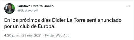 “En los próximos días Didier La Torre será anunciado por un club de Europa”, escribió el mencionado periodista sin especificar si se será de primera división, ni de que país. Recordemos que venía entrenando en el Cercle Brugge de la primera de Bélgica. Esperamos, desde acá, que tenga regularidad y mejore. ¡Hay futuro!