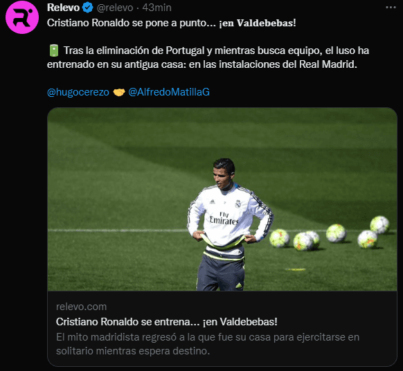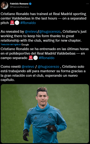 El periodista más reconocido en torno a los fichajes del mercado de pases, Fabrizio Romano, publicó un estado donde CR7 es el protagonista de todo: “Cristiano Ronaldo se ha entrenado en las últimas horas en el polideportivo del Real Madrid Valdebebas — en campo separado. Como reveló (Relevo / Hugo Cerezo), Cristiano solo está trabajando allí para mantener su forma gracias a la gran relación con el club, esperando un nuevo capítulo”.