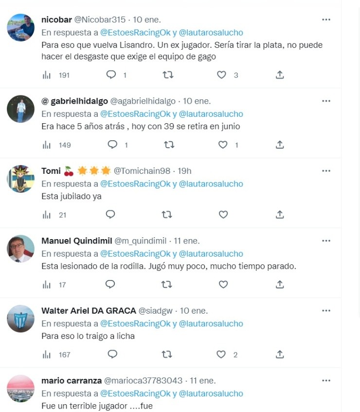 “Para eso que vuelva Lisandro. Un ex jugador. Sería tirar la plata, no puede hacer el desgaste que exige el equipo de Gago“, “Era hace 5 años atrás, hoy con 39 se retira en junio”, “Está lesionado de la rodilla. Jugó muy poco, mucho tiempo parado”, comentaron algunos usuarios de la red social Twitter.
