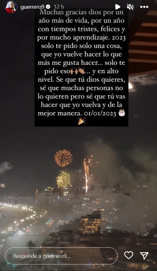 “Muchas gracias Dios por un año más de vida, por un año con tiempos tristes, felices y por mucho aprendizaje. 2023, solo te pido una cosa: que yo vuelva a hacer lo que más me gusta hacer, solo te pido eso. Y en alto nivel. Sé que tu, Dios, quieres, sé que muchas personas no lo quieren, pero sé que tú vas a hacer que yo vuelva y de la mejor manera. 01/01/2023”