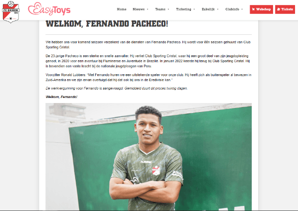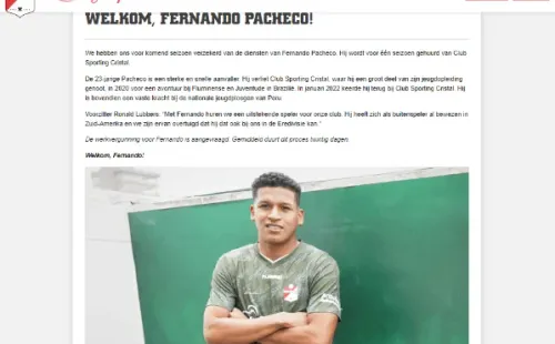 “Pacheco, de 23 años, es un atacante fuerte y rápido. Dejó el Club Sporting Cristal, donde disfrutó gran parte de su cantera, en 2020 por una aventura con Fluminense y Juventude en Brasil. En enero de 2022 regresó al Club Sporting Cristal. También es una fuerza permanente en las selecciones juveniles nacionales de Perú”. Saludó, de esa manera, el club que recientemente ascendió a la Eredivisie. Las mejores de las suertes para él.