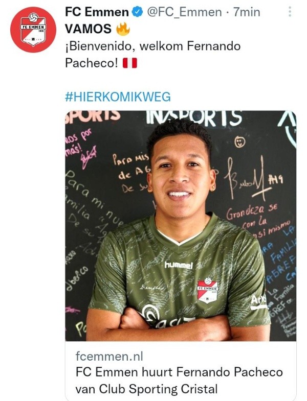 Porque el club a donde se marcha, FC Emmen (de los Países Bajos) subió esta confirmación: “���������� ¡Bienvenido, welkom Fernando Pacheco!”. Fue lo que mencionó en su cuenta de Twitter, para después en su página web darle la bienvenida con una interesante reseña de su carrera.