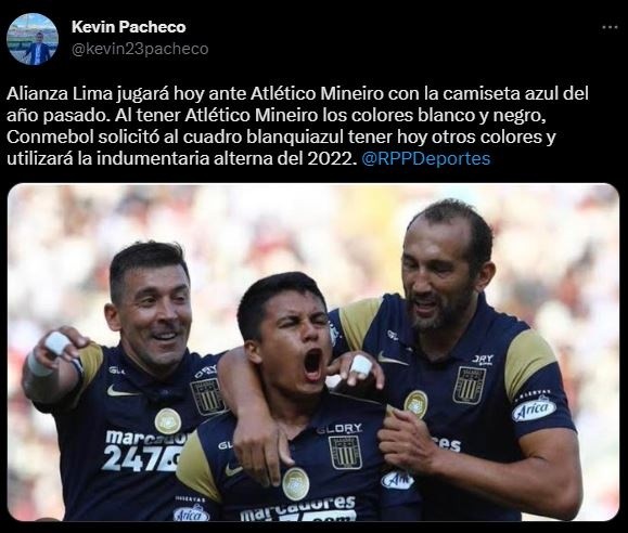 “Alianza Lima jugará hoy ante Atlético Mineiro con la camiseta azul del año pasado. Al tener Atlético Mineiro los colores blanco y negro, Conmebol solicitó al cuadro blanquiazul tener hoy otros colores y utilizará la indumentaria alterna del 2022”. Mencionó el comunicador social.