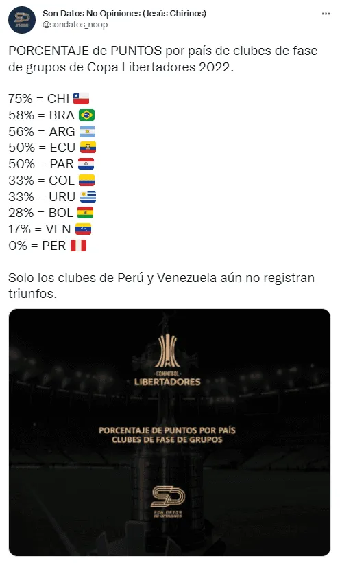 El medio digital ‘Son Datos No Opinines’ compartió estos números donde sorpresivamente se puede observar que los clubes chilenos superan en cantidad de puntos obtenidos a los argentinos y brasileños. Si bien a penas se han disputado dos fechas, lo cierto es que equipos como la Universidad Católica y Colo Colo han sorprendido con su nivel de competencia internacional.