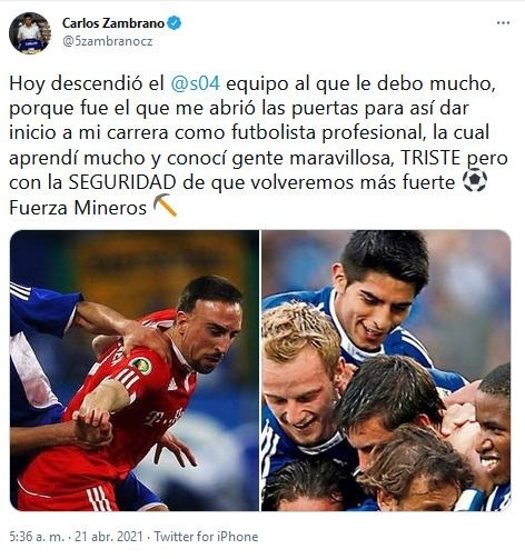 “Hoy descendió el Schalke, equipo al que le debo mucho, porque fue el que me abrió las puertas para así dar inicio a mi carrera como futbolista profesional, la cual aprendí mucho y conocí gente maravillosa, TRISTE pero con la SEGURIDAD de que volveremos más fuerte Fuerza Mineros”, escribió el central.